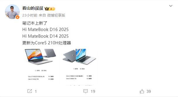 Hi MateBook D16 2025款,在处理器上更新为全新酷睿5 210H处理器。